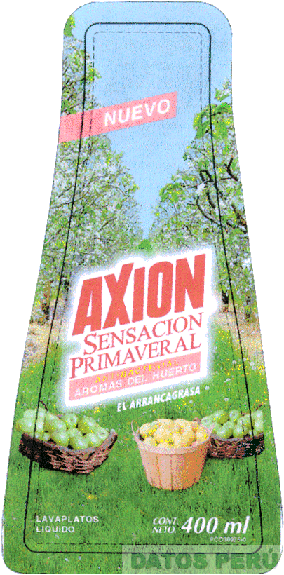 LA DENOMINACION AXION SENSACION PRIMAVERAL AROMAS DEL HUERTO, EN LETRAS CARACTERISTICAS, SOBRE FONDO FORMADO POR UN PAISAJE CAMPESTRE QUE INCLUYE TRES CESTOS DE FRUTAS, TODO DENTRO DE UNA ETIQUETA DE FORMA IRREGULAR Y EN LOS COLORES CELESTE, VERDE, MARRON, AMARILLO, ROJO, ROSADO, BLANCO Y NEGRO, CONFORME AL FACSIMIL ADJUNTO