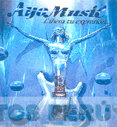 El logotipo conformado en la parte superior por la denominación AYOMUSIC LIBERA TU EXPRESIÓN escrita en letras características, en el centro se aprecia la figura estilizada de una persona de la cual sobresale la figura de una guitarra con esferas a los lados; todo en los colores azul, negro, turquesa y marrón; conforme al modelo adjunto