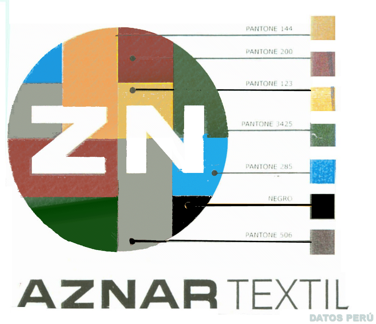 EL LOGOTIPO CONFORMADO POR LA DENOMINACION AZNAR TEXTIL Y SOBRE ELLA UNA FIGURA CIRCULAR CONTENIENDO LAS LETRAS ZN, TODO EN LOS COLORES ANARANJADO (PANTONE 144), ROJO BURDEOS (PANTONE 200), AMARILLO OSCURO (PANTONE 123), VERDE OSCURO (PANTONE 3425), AZUL OSCURO (PANTONE 285), GRANATE (PANTONE 506), NEGRO Y BLANCO; CONFORME AL MODELO ADJUNTO