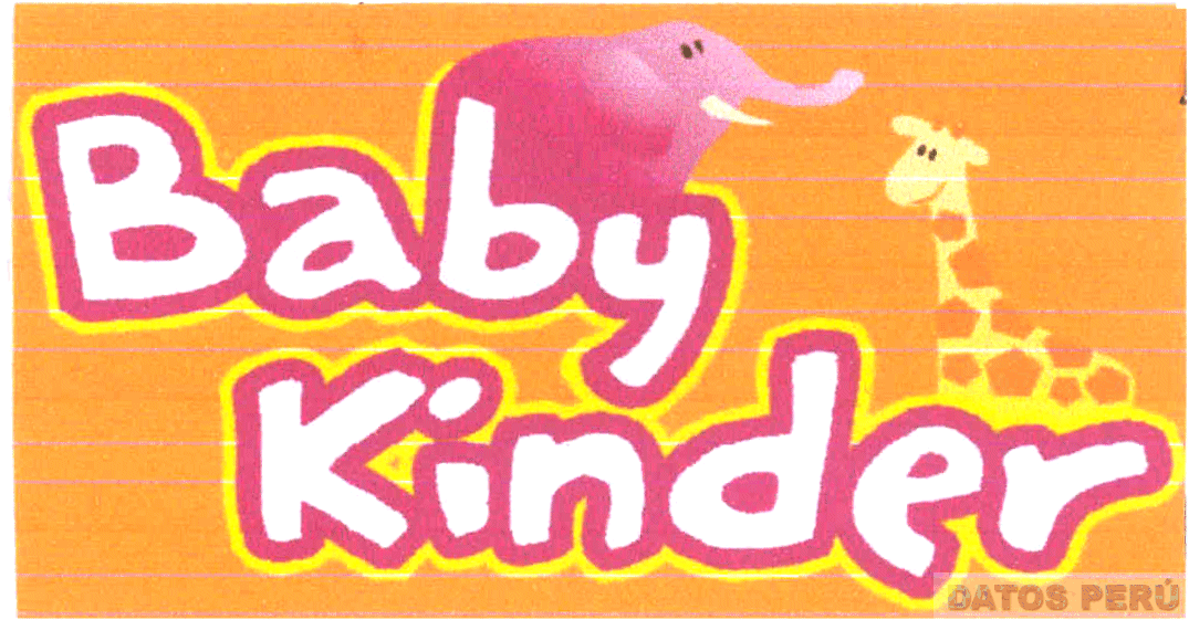 El logotipo conformado por la denominación BABY KINDER escrita en letras características y la representación caricaturizada de un elefante y una jirafa sobre las dos últimas letras de la palabra BABY y KINDER respectivamente, todo en los colores morado, amarillo, anaranjado y rosado; conforme al modelo adjunto