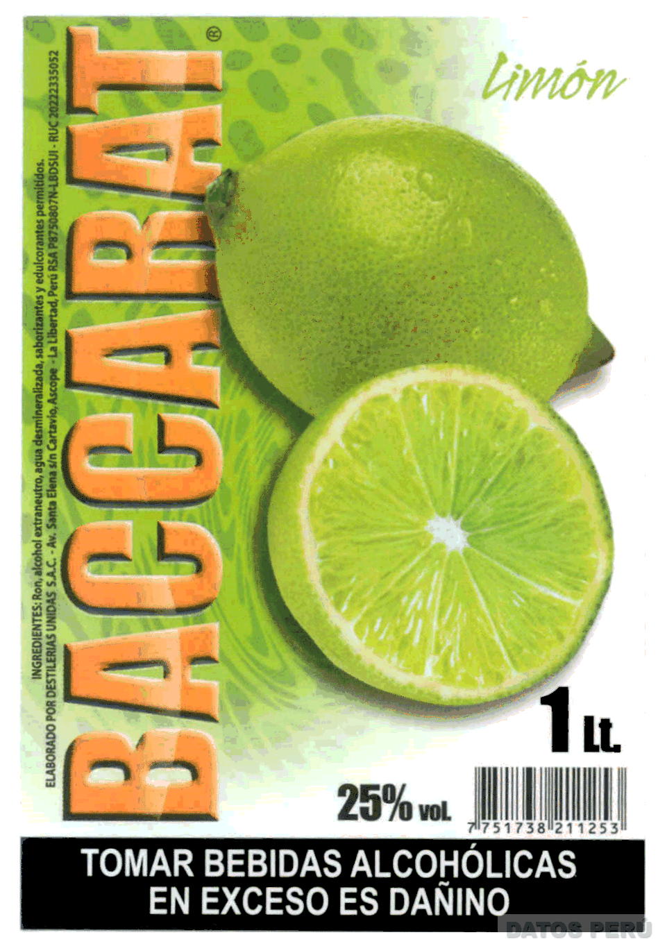 La etiqueta rectangular con fondo de color verde y blanco en distintas tonalidades; en la parte izquierda aparece la denominación BACCARAT escrita en letras características de color anaranjado en distintas tonalidades con bordes negros en forma vertical, seguida de la figura de dos limones, uno entero y otro partido a la mitad, sobre los cuales aparece la denominación LIMÓN escrita en letras características de color verde; asimismo, se aprecia la denominación ELABORADO POR DESTILERAS UNIDAS S.A.C.; y demás leyendas alusivas al producto (sin reivindicar); conforme al modelo adjunto