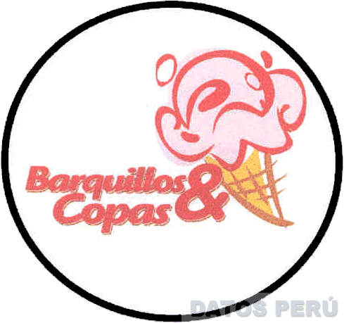 La denominación BARQUILLOS & COPAS escrita en letras características y al lado derecho el diseño estilizado de un barquillo de helado, todo dentro de una figura circular, en los colores negro, rojo, rosado, blanco, marrón claro y amarillo; conforme al modelo adjunto