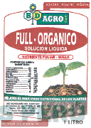 La etiqueta rectangular conteniendo la denominación FULL-ORGANICO escrita en letras características dentro de una figura ovalada, en la parte superior se observan las letras B y D estilizadas, cada una al interior de una figura hexagonal y la representación estilizada de una flor, a la derecha una figura rectangular donde se observan las palabras AGRO SAC escritas en letras estilizadas, en la parte inferior derecha se aprecia la representación estilizada de una planta, todo en los colores rojo, verde, marrón y amarillo; conforme al modelo adjunto