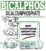 La denominación BICALPHOS escrita en letras características dentro de un cuadro, en la parte inferior se aprecia la palabra DICALCIUMPHOSPHATE subrayada con dos líneas, debajo las figuras estilizadas de una vaca, un pollo y un cerdo, encerradas en un círculo, una debajo de la otra, al lado derecho se aprecia un recuadro de línea gruesa, y en su interior otro recuadro de menor tamaño conteniendo la denominación BEST PHOSPHORUS ABSORPTION GUARANTEE, debajo de ésta dos líneas juntas en diagonal, y demás leyendas alusivas al producto, todo en los colores negro, verde y blanco; conforme al modelo adjunto.