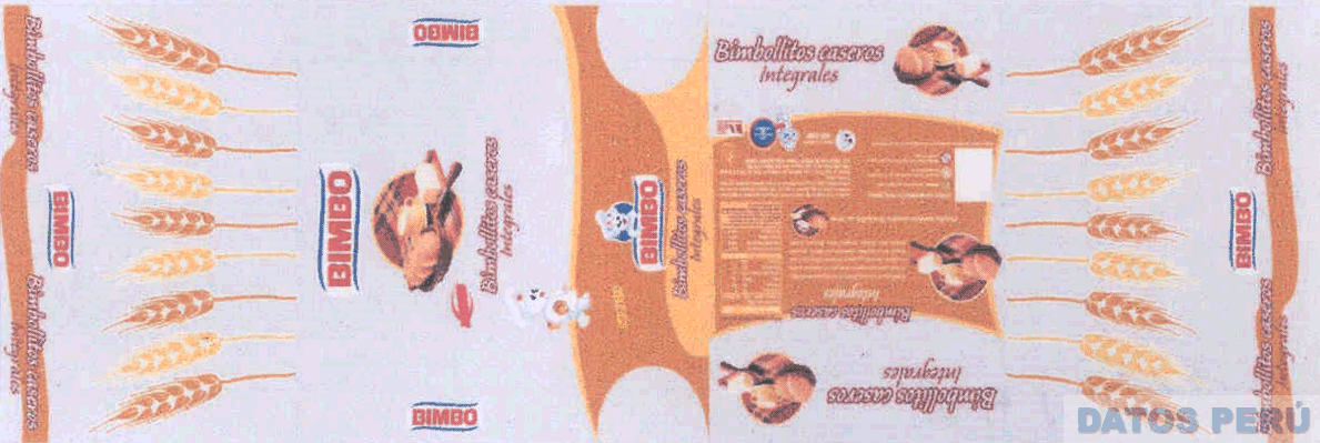 La etiqueta conteniendo la representación de espigas, la denominación BIMBO escrita en letras características entre líneas ondulantes y la representación de un oso estilizado con gorro de cocinero, la representación de un desayuno y la denominación BIMBOLLITOS CASEROS INTEGRALES escrita en letras características y la representación de un oso con panes bajo un brazo y figuras irregulares y demás leyendas alusivas al producto todo en la combinación de colores rojo, amarillo, marrón claro, marrón oscuro, blanco y azul; conforme al modelo adjunto