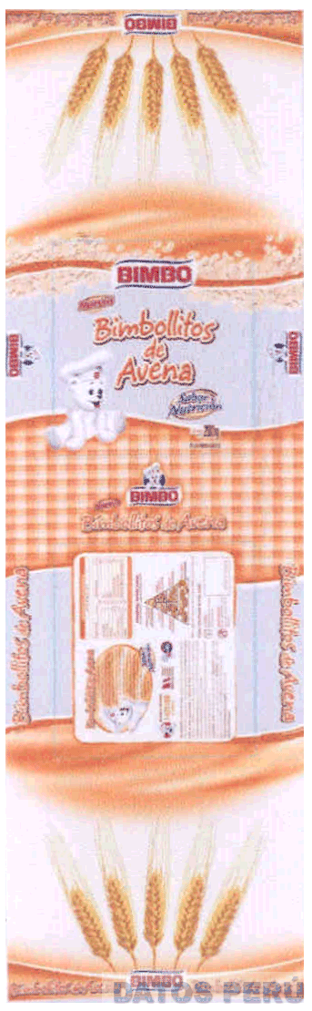La etiqueta de forma rectangular que contiene la denominación BIMBO escrita en letras características y figuras de osos estilizados con gorros de cocinero, granos de avena y espigas, como fondo se aprecia la frase BIMBOLLITOS DE AVENA escrita en letras características, líneas onduladas, líneas cuadriculadas, elementos y frases alusivas al producto sin reivindicar, todo en los colores blanco, gris, azul, rojo, anaranjado y amarillo; conforme al modelo adjunto