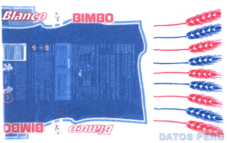 La etiqueta conformada por la denominación BIMBO escrita en letras características, al lado la figura estilizada de un oso con gorro de cocinero y la denominación BLANCO escrita en letras características, en el lado derecho las figuras estilizadas de espigas, en los colores azul, rojo, blanco, celeste; conforme al modelo adjunto