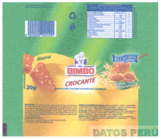 La envoltura desplegada con las denominaciones BIMBO, CROCANTE, AVENA, MIEL Y ALMENDRAS y 85 CALORIAS, la figura estilizada de un osito con gorro de cocinero, la representación de una barra de cereal, paleta de miel, espigas y almendras y demás elementos y frases informativas del producto sin reivindicar, todo en letras características, en los colores verde, rojo, amarillo, blanco, azul, anaranjado y marrón; conforme al modelo adjunto