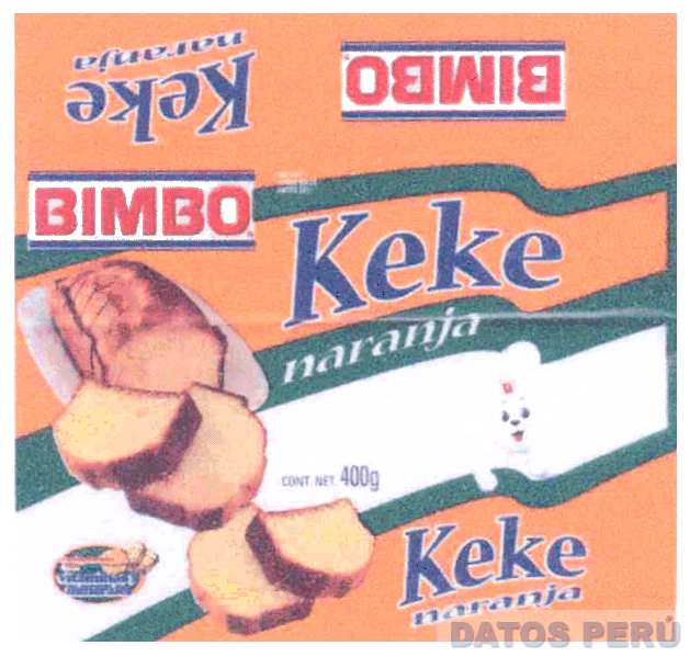 La etiqueta conformada por la denominación KEKE NARANJA escrita en letras características en la parte inferior la figura estilizada de un oso con gorro de cocinero al lado izquierdo la figura estilizada de un keke cortado en rodajas debajo de la denominación BIMBO escrita en letras características en los colores anaranjado, blanco, azul, rojo, amarillo, marrón claro y verde; conforme al modelo adjunto
