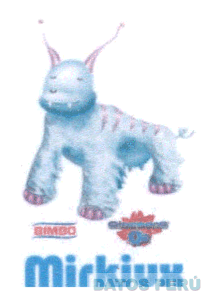 La figura de un personaje característico, en la parte inferior la denominación BIMBO escrita en letras características, apreciándose dos líneas ondulantes debajo y sobre la denominación citada, al lado derecho la denominación OLOCOONS O2 escrita en letras características sobrepuesta a un diseño característico, y debajo de dichas denominaciones se aprecia la denominación MIRKIUX escrita en letras características, todo en la combinación de colores rojo, azul, blanco, celeste y rosado; conforme al modelo adjunto