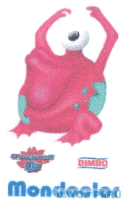 La figura de un personaje característico, en la parte inferior la denominación BIMBO escrita en letras características, apreciándose dos líneas ondulantes debajo y sobre la denominación citada, al lado derecho la denominación OLOCOONS O2 escrita en letras características sobrepuesta a un diseño característico, y debajo de dichas denominaciones se aprecia la denominación MONDOCLOR escrita en letras características, todo en la combinación de colores rojo, azul, blanco, verde y fucsia; conforme al modelo adjunto