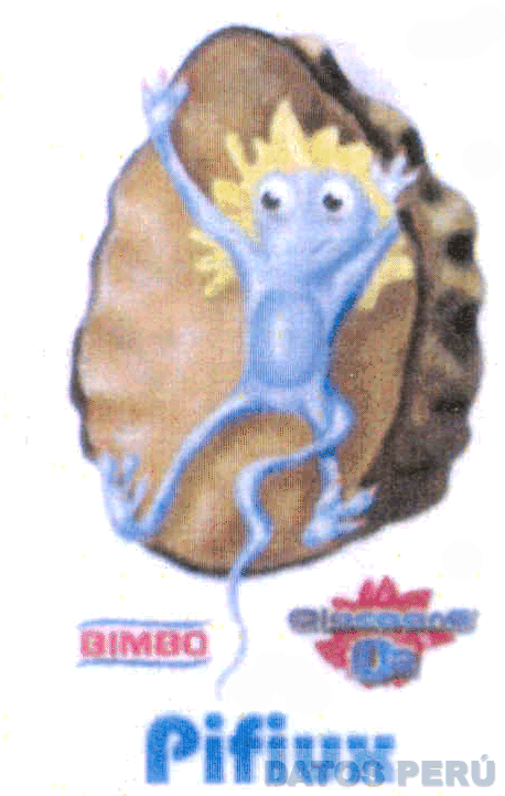 La figura de un personaje característico sobrepuesta a un diseño estilizado, en la parte inferior la denominación BIMBO escrita en letras características, apreciándose dos líneas ondulantes debajo y sobre la denominación citada, al lado derecho la denominación OLOCOONS O2 escrita en letras características sobrepuesta a un diseño característico, y debajo de dichas denominaciones se aprecia la denominación PIFIUX escrita en letras características, todo en la combinación de colores rojo, azul, blanco, celeste, beige, amarillo y tonalidades del color marrón; conforme al modelo adjunto