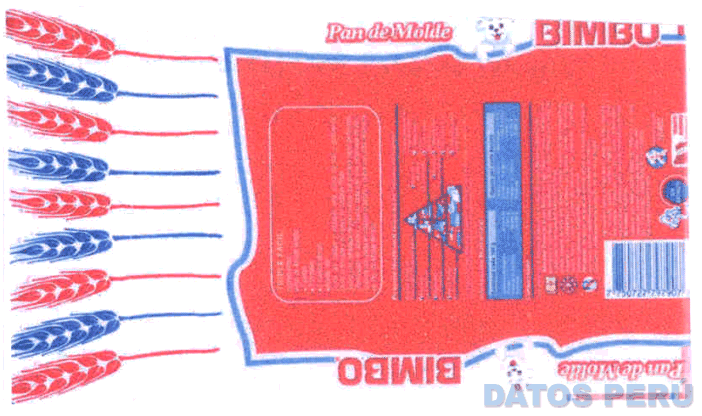 La etiqueta en cuyo interior se aprecia figura de espigas, la denominación BIMBO escrita en letras características y figuras de un oso estilizado con gorro de cocinero, la denominación PAN DE MOLDE y un recuadro con líneas onduladas y demás elementos sin reivindicar, en los colores blanco, azul, rojo y celeste; conforme al modelo adjunto