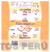 La etiqueta en cuyo interior se aprecian las figuras estilizadas de espigas, tostadas untadas con alimentos y una taza de café, la denominación BIMBO escrita en letras características entre líneas onduladas y la figura estilizada de un oso con gorro de cocinero, las denominaciones TOSTADAS INTEGRALES 100% y CON FIBRA PREBIÓTICA escritas en letras características, donde la última frase se encuentra dentro de una figura irregular, líneas onduladas y demás elementos y leyendas informativas del producto sin reivindicar; todo en los colores blanco, azul, rojo, amarillo, anaranjado, verde y marrón; conforme la modelo adjunto