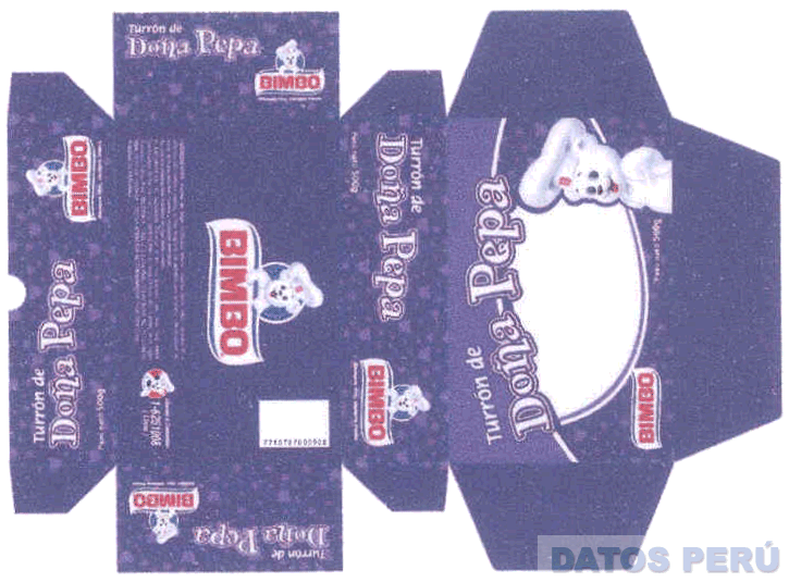 El diseño de una envoltura desplegada, en la cual se aprecia la denominación TURRON DE DOÑA PEPA escrita en letras características sobre una línea arqueada y en la parte inferior la denominación BIMBO escrita en letras características dentro de líneas ondeadas, al lado derecho se aprecia la figura de un osito, en el fondo se aprecian figuras circulares y demás elementos sin reivindicar, todo en la combinación de colores morado, blanco, rojo y azul; conforme al modelo adjunto