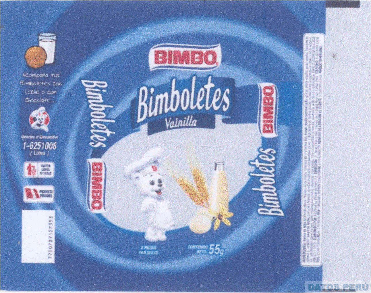 La envoltura desplegada conformada por las denominaciones BIMBOLETES VAINILLA y BIMBO escrita en letras características y figuras estilizadas de un osito cocinero, una botella de leche, dos espigas, dos huevos, una flor, un vaso y un keke todo dentro de un espiral y demás frases alusivas al producto sin reivindicar, en la combinación de colores azul, celeste, blanco, amarillo y rojo; conforme al modelo adjunto