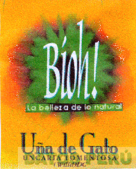 LA ETIQUETA DE INTERIOR ANARANJADO QUE EN SU PARTE CENTRAL LLEVA LA DENOMINACION BIOH ESCRITA EN LETRAS CARACTERISTICAS CON UN SIGNO DE ADMIRACION EN COLOR BLANCO SOBRE UN FONDO COMPUESTO POR UNA SERIE DE FIGURAS Y UN RESPLANDOR EN COLORES OCRE, MARRON Y VERDE; EN SU PARTE INFERIOR SE LEE LA BELLEZA DE LO NATURAL EN COLOR BLANCO Y DEBAJO DATOS RELATIVOS AL PRODUCTO (UÑA DE GATO) EN COLORES VERDE Y NEGRO; CONFORME AL MODELO ADJUNTO,