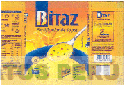 La etiqueta con la denominación BITAZ escrita en letras características, sobresaliendo la letra B dentro de un rectángulo que se repite varias veces y la frase FORTIFICADOR DE SOPAS y la figura de dos niños con los brazos abiertos y un pote y cuchara con sopa y dentro de una figura rectangular la palabra 12 VITAMINAS Y MINERALES y a los costados palabras alusivas al producto, todo en los colores anaranjado, amarillo, azul, blanco, rojo; conforme al modelo adjunto