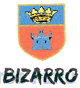 El logotipo conformado por la denominación BIZARRO escrita en letras características, acompañada en la parte superior por la figura estilizada de un escudo en cuyo interior se aprecia la figura estilizada de una corona y un castillo; todo en los colores amarillo, azul, rojo, negro, dorado y celeste; conforme al modelo adjunto