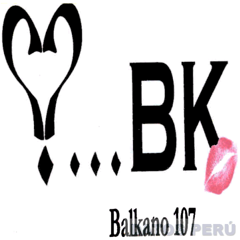 El logotipo conformado por la denominación BALKANO 107 escrita en forma característica, en la parte superior se aprecian dos signos de interrogación que forman un corazón y tres puntos suspensivos, al lado derecho se aprecian las letras BK estilizadas y la representación de unos labios, sin reivindicar colores; conforme al modelo adjunto
