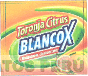 La etiqueta cuyo fondo contiene el diseño estilizado de líneas circulares que se asemejan a un remolino, consignándose en la parte central la denominación BLANCOX escrita en letras características, sobre la cual se consigna la denominación TORONJA CITRUS escrita en letras características y debajo, sobre una banda horizontal, se consigna la denominación BLANQUEADOR DESINFECTANTE, éstas últimas sin reivindicar, y al lado inferior derecho se puede apreciar el diseño estilizado de dos naranjas, todo en la combinación de colores verde, amarillo, anaranjado, blanco, rojo, azul; conforme al modelo adjunto
