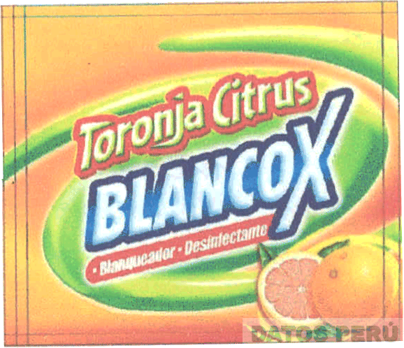 La etiqueta cuyo fondo contiene el diseño estilizado de líneas circulares que se asemejan a un remolino, consignándose en la parte central la denominación BLANCOX escrita en letras características, sobre la cual se consigna la denominación TORONJA CITRUS escrita en letras características y debajo, sobre una banda horizontal, se consigna la denominación BLANQUEADOR DESINFECTANTE, éstas últimas sin reivindicar, y al lado inferior derecho se puede apreciar el diseño estilizado de dos naranjas, todo en la combinación de colores verde, amarillo, anaranjado, blanco, rojo, azul; conforme al modelo adjunto