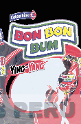 La etiqueta conformada por la denominación BON BON BUM escrita en letras características y dentro de una figura irregular, en la parte superior se aprecia la denominación COLOMBINA escrita en letras características y dentro de un rectángulo, al lado derecho se observa un rombo conteniendo la representación de una media luna y sobre ella una mujer sentada, en la parte inferior se observa la denominación YING-YANG escrita en letras características y las figuras de dos chupetes, uno sin envoltura y el otro con envoltura, en el fondo se aprecian figuras circulares, todo en los colores rojo, blanco, negro, azul, verde y amarillo; conforme al modelo adjunto