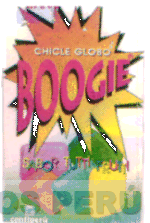LA ETIQUETA DE FONDO BLANCO Y VERDE SOBRE EL QUE APARECE LA FIGURA QUE REPRESENTA UNA EXPLOSION QUE VA DEL COLOR AMARILLO AL ANARANJADO. SOBRE ESTA FIGURA APARECE LA DENOMINACION CHICLE GLOBO EN LETRAS DE COLOR BLANCO DEBAJO DE LA CUAL SE ENCUENTRA LA PALABRA BOOGIE EN LETRAS DE COLOR FUCSIA.EN LA PARTE INFERIO