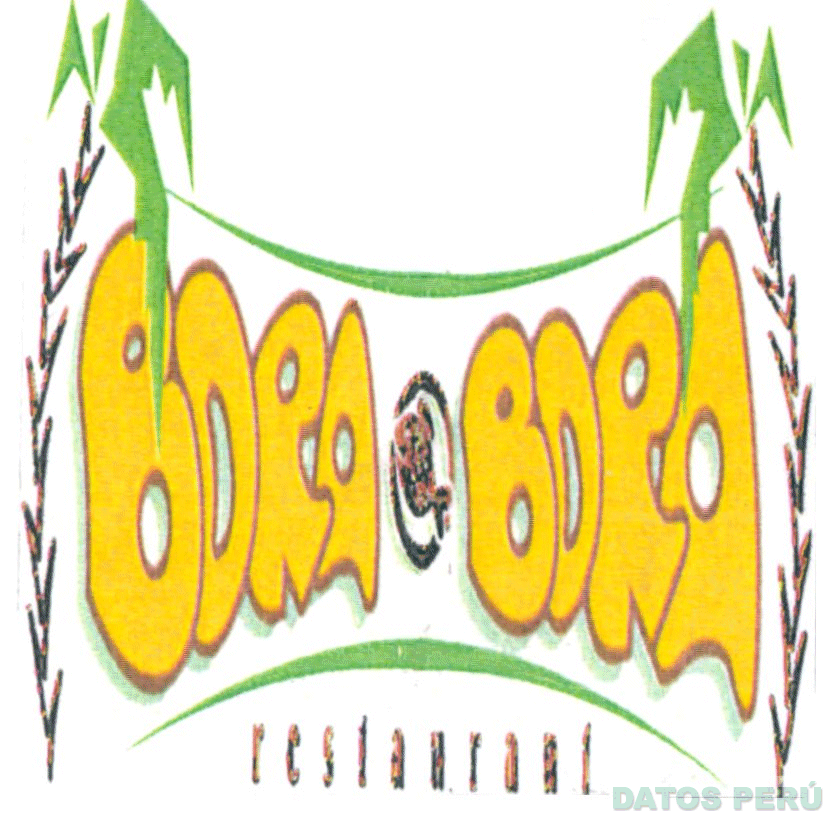El logotipo constituido por la denominación BORA BORA escrita en letras características en colores amarillo y marrón, entre estas palabras se aprecia una figura circular y la representación de un pez en color marrón, todo esto rodeado por dos palmeras en los colores verde y marrón y dos rayas horizontales curvas en color verde, conforme al modelo