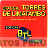 EL LOGOTIPO CONFORMADO POR LA DENOMINACION BOTICA TORRES DE LIMATAMBO EN LETRAS MAYUSCULAS DE COLOR AMARILLO, LA FRASE DESCUENTOS DE SIEMPRE EN LETRAS MINUSCULAS DE COLOR AMARILLO, LA PALABRA BOTICAS EN LETRAS MAYUSCULAS DE COLOR AMARILLO DENTRO DE UN RECTANGULO DE COLOR AZUL CON BORDES REDONDEADOS, LAS INICIALES "BTL" EN LETRAS MAYUSCULAS DE COLOR AMARILLO DENTRO DE UNA FIGURA ROMBOIDE DE COLOR AZUL, LA PALABRA BOTICAS EN LETRAS MAYUSCULAS DE COLOR AMARILLO DENTRO DE UN RECTANGULO DE COLOR AZUL CON BORDES REDONDEADOS, TODO DENTRO DE UN RECUADRO CON FONDO ROJO; CONFORME AL MODELO ADJUNTO,