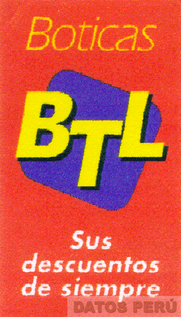 EL LOGOTIPO CONFORMADO POR UNA FIGURA RECTANGULAR VERTICAL DE FONDO ROJO DENTRO DEL CUAL SE APRECIA LA DENOMINACION BOTICAS ESCRITA EN LETRAS CARACTERISTICAS DE COLOR AMARILLO, DEBAJO, LAS LETRAS BTL MAYUSCULAS DE COLOR AMARILLO CON SOMBRA DENTRO DE UNA FIGURA ROMBOIDE DE FONDO AZUL, Y LA FRASE SUS DESCUENTOS DE SIEMPRE DE COLOR BLANCO; CONFORME AL MODELO ADJUNTO