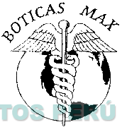 El logotipo conformado por una figura circular que presenta el globo terráqueo sobre la cual se aprecia una figura formada por dos serpientes alrededor de una barra y dos alas, y la denominación BOTICAS MAX escrita en letras características en la parte superior, todo en los colores blanco y negro; conforme al modelo adjunto