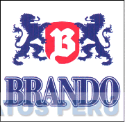La denominación BRANDO escrita en letras características en cuya parte superior se aprecia la silueta de dos leones sosteniendo la letra B escrita en letras características la cual está encerrada por una figura circular; en los colores rojo, blanco y azul; conforme al modelo adjunto