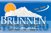 La denominación BRUNNEN escrita en letras características en color blanco y subrayado en una línea color anaranjado; en la parte superior la representación de un glacial de color blanco y gris claro, al lado izquierdo la figura de un sol en color anaranjado, todo sobre fondo color azul en degradé; conforme al modelo adjunto