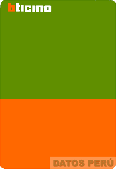 LA ETIQUETA CUADRANGULAR QUE TIENE EN LA PARTE SUPERIOR, UNA FIGURA RECTANGULAR CON LA DENOMINACIÓN BTICINO EN CARACTERES ESTILIZADOS Y, EN LA PARTE INFERIOR, OTRA FIGURA RECTANGULAR, EN LA COMBINACIÓN DE COLORES BLANCO, ANARANJADO Y VERDE; CONFORME AL MODELO ADJUNTO