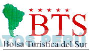 El logotipo conformado por la denominación BTS BOLSA TURÍSTICA DEL SUR escrita en letras características; en la parte superior se aprecian 5 estrellas y al lado izquierdo un mapa de sudamércia debajo 2 líneas horizontales; todo en los colores rojom verde y negro; conforme al modelo adjunto.