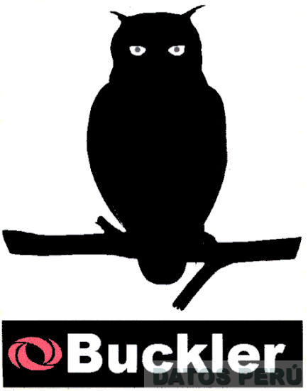 El logotipo conformado por la denominación BUCKLER escrita en letras características, al lado izquierdo se aprecia una figura irregular conformada por cuatro semi lunas, todo dentro de un rectángulo; en la parte superior se observa un búho parado sobre una rama de árbol; todo en los colores rojo, blanco y negro; conforme al modelo adjunto