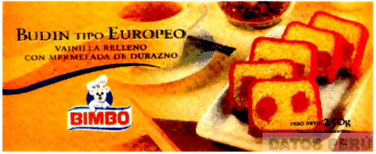 LA ETIQUETA CONSTITUIDA POR LA DENOMINACION BUDIN TIPO EUROPEO VAINILLA RELLENO CON MERMELADA DE DURAZNO (SIN REIVINDICAR) ESCRITA EN LETRAS CARACTERISTICAS, LA DENOMINACION BIMBO ESCRITA EN LETRAS CARACTERISTICAS Y FIGURA DE UN OSITO CON GORRO COCINERO EN LA QUE SE APRECIA LA LETRA B ESTILIZADA, LA FIGURA DE TAZA Y PLATOS CON REBANADAS DE KEKE, TODO EN LOS COLORES BLANCO, ROJO, AMARILLO, AZUL, ANARANJADO Y MARRON; CONFORME AL MODELO ADJUNTO
