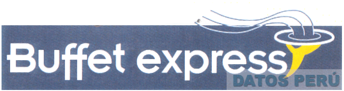 La denominación BUFFET EXPRESS escrita en letras características sobre un rectángulo en el que figura el diseño estilizado de una mano cargando un plato humeante, en los colores azul, amarillo y blanco según modelo adjunto