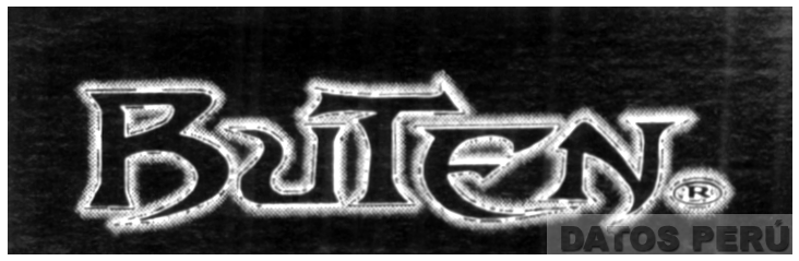 EL LOGOTIPO CONFORMADO POR LA DENOMINACION BUTEN, ESCRITA EN LETRAS ESTILIZADAS CON BORDES DELINEADOS BLANCOS Y FONDO DE LAS LETRAS COLOR NEGRO, CONFORME AL MODELO ADJUNTO,