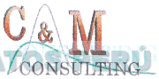 El logotipo rectangular que contiene la denominación C & M CONSULTING CONSULTING escrita en letras características y dos líneas irregulares, en la combinación de colores marrón, en distintas tonalidades, blanco, celeste y gris; conforme al modelo adjunto.