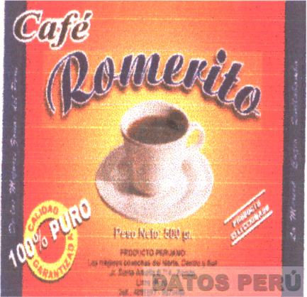 LA DENOMINACION CAFE ROMERITO Y FIGURA DE UNA TAZA CONTENIENDO CAFE, EN LA PARTE INFERIOR SE APRECIA UN CIRCULO DONDE SE LEE CALIDAD GARANTIZADA - 100% PURO CON DOS VENDAS AZULINAS AL EXTREMO DE CADA LADO; TODO EN LOS COLORES MARRON, AZUL, BLANCO, AMARILLO Y ANARANJADO; SEGUN MODELO ADJUNTO,
