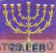 El logotipo conformado por la denominación CALEB escrita en letras características, en la parte superior se aprecia un candelabro, todo sobre un fondo irregular y en la combinación de colores negro, amarillo en diversas tonalidades, marrón en diversas tonalidades, morado y gris; conforme al modelo adjunto