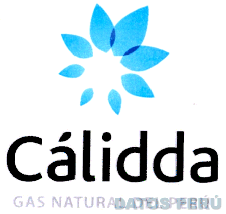 La denominación CÁLIDDA GAS NATURAL DEL PERÚ escrita en letras características acompañada de una figura irregular que representa una flama de gas natural, en los colores celeste, azul y gris; conforme al modelo adjunto
