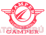 El logotipo conformado por una fecha partida a la mitad saliente de un círculo de doble línea rodeado por otro con la denominación CAMPER, acompañado a los costados por líneas diseñadas, en la parte inferior se aprecia un semiborde con la frase GENUINE STYLE y más abajo la denominación CAMPER; todo en colores rojo y blanco, conforme al modelo adjunto