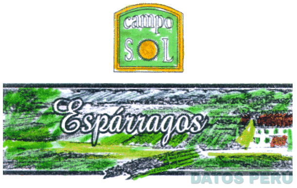LA ETIQUETA CON LA DENOMINACION CAMPO SOL ESCRITA EN LETRAS CARACTERISTICAS DENTRO DE UN RECUADRO, LA LETRA O DE LA PALABRA SOL ESTA CONSTITUIDA POR LA FIGURA DE UN SOL, EN LA PARTE INFERIOR UN RECTANGULO CON LA DENOMINACION ESPARRAGOS ESCRITA EN LETRAS CARACTERISTICAS SOBRE LA FIGURA DE UN CAMPO; TODO EN LA COMBINACION DE COLORES VERDE, AMARILLO Y BLANCO, SIN REIVINDICAR EL COLOR MARRON; CONFORME AL MODELO ADJUNTO,