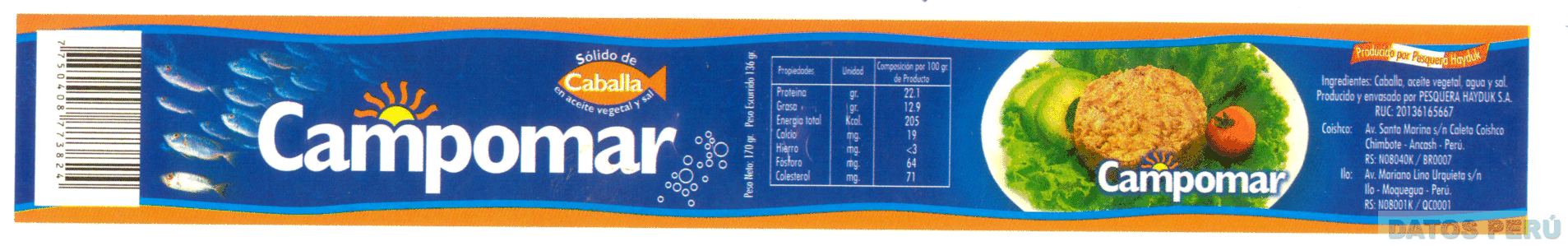 LA ETIQUETA EN CUYO INTERIOR SE APRECIA LA DENOMINACION CAMPOMAR ESCRITA EN LETRAS CARACTERISTICAS, LA REPRESENTACION DE UN PLATO CON SOLIDO DE CABALLA, ASI COMO DE UN SOL, UNAS BURBUJAS Y UNOS PECES PEQUEÑOS, Y A AMBOS EXTREMOS FRASES ALUSIVAS AL PRODUCTO Y CARACTERISTICAS DEL MISMO, TODO EN LA COMBINACION DE LOS COLORES AZUL, ROJO, BLANCO, CELESTE Y ANARANJADO; CONFORME AL MODELO ADJUNTO