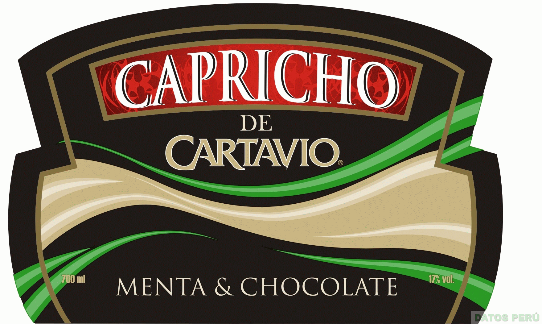 La etiqueta de forma irregular en color negro con borde de color dorado en cuya parte superior aparece una figura de forma irregular de fondo color rojo con bordes de color dorado conteniendo la denominación CAPRICHO escrita en letras características de color blanco con bordes de color negro y dorado; debajo aparece la denominación DE CARTAVIO escrita en letras características de color beige con bordes blanco y la letra R dentro de un círculo (sin reivindicar); asimismo, aparecen unas figuras ondulantes irregulares en los colores verde, beige y blanco; en la parte inferior aparece la denominación MENTA & CHOCOLATE escrita en letras características de color beige y demás leyendas alusivas al producto (sin reivindicar); conforme al modelo adjunto