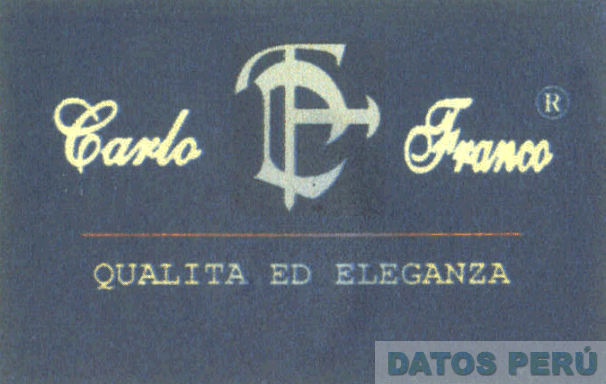 EL LOGOTIPO CONFORMADO POR LA DENOMINACION CARLO FRANCO ESCRITA EN LETRAS CARACTERISTICAS EN EL CENTRO SE APRECIA EL DISEÑO ESTILIZADO DE LAS LETRAS C Y F, DEBAJO UNA LINEA HORIZONTAL; EN LA PARTE INFERIOR SE OBSERVA LA FRASE QUALITA ED ELEGANZA, TODO EN LOS COLORES AZUL, PLOMO, BEIGE Y ROJO; CONFORME AL MODELO ADJUNTO
