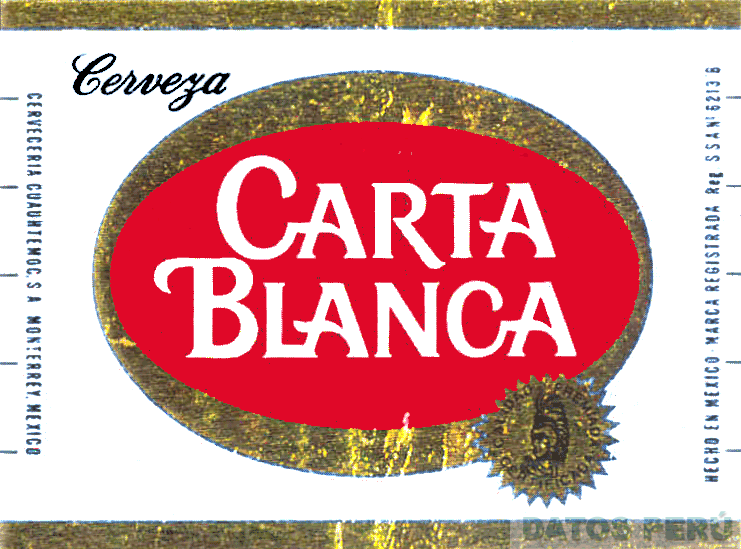 La etiqueta de fondo color blanco con borde superior e inferior de color dorado, que contiene en la parte central la denominación CARTA BLANCA escrita en letras características de color blanco, dentro de un óvalo color rojo, en la parte baja se observa una figura circular color dorado, con la cabeza de un guerrero con casco de plumas en color negro; conforme al modelo adjunto